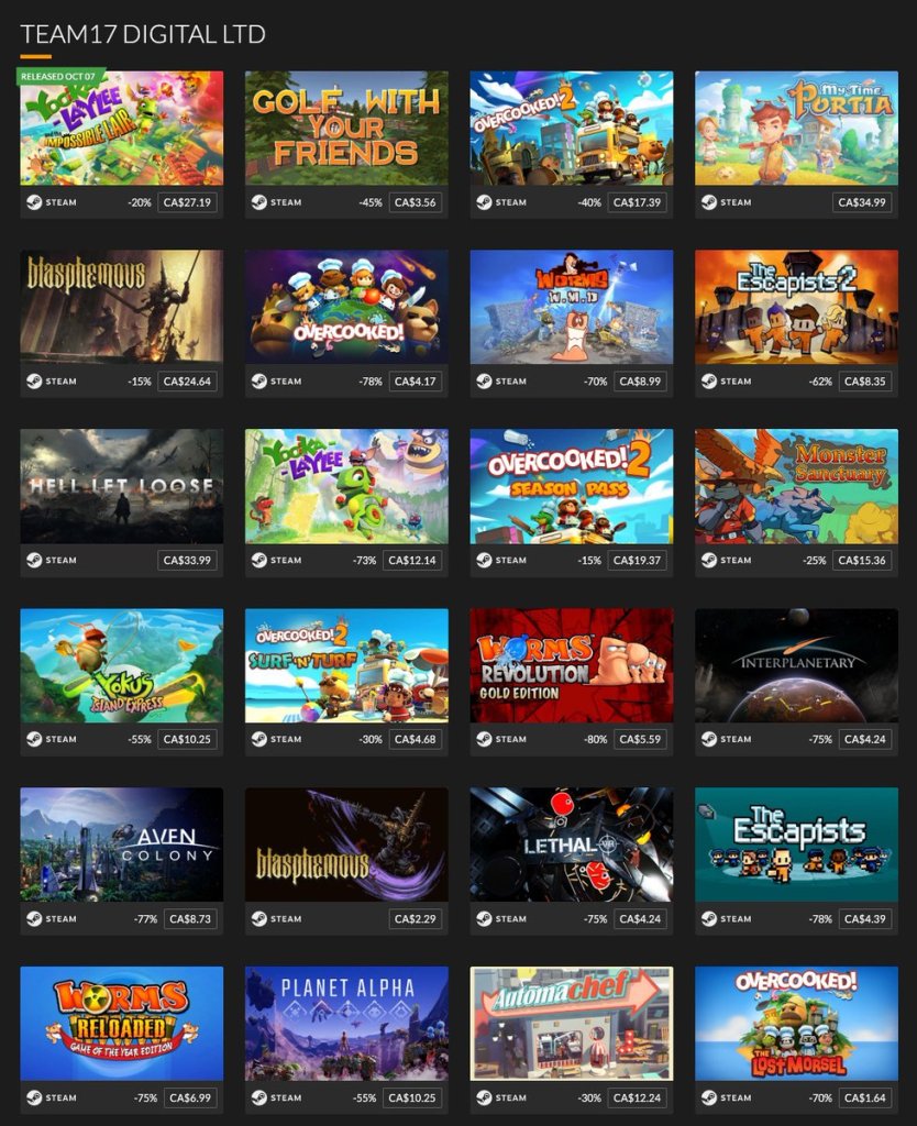 Team 17 Digital catalog goes on sale, for Steam on PC. The sale boasts discounts as high as 80%, and is scheduled to run until October 21st.