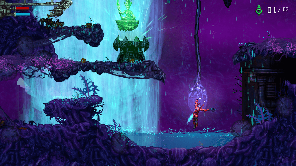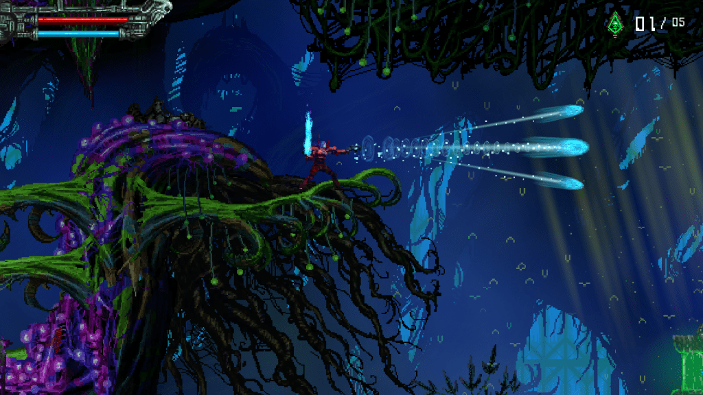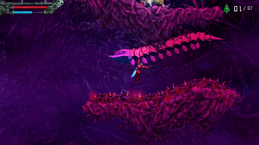 Being inspired by Contra, there is plenty of platforming involved in Valfaris, including riding flying cybernetic worms above terrain that would one-shot Therion if he tried running on it. As far as the shooting goes, there are 19 weapons to choose from and three different weapon categories: Pistol, melee, and “Destroyer.” The pistol weapons have unlimited ammo and all of them shoot different sorts of ammo from each other. The first one Therion starts with shoots three long range missiles that shoot 30 degrees apart; one missile being centered. Then there is another pistol that’s a rail gun, which shoots a straight and narrow laser that penetrates enemies for equal damage across the screen. And destroyer? Well, I think it’s best you have fun finding out more about them yourself, as the feeling of their impact can only be felt first-hand.
