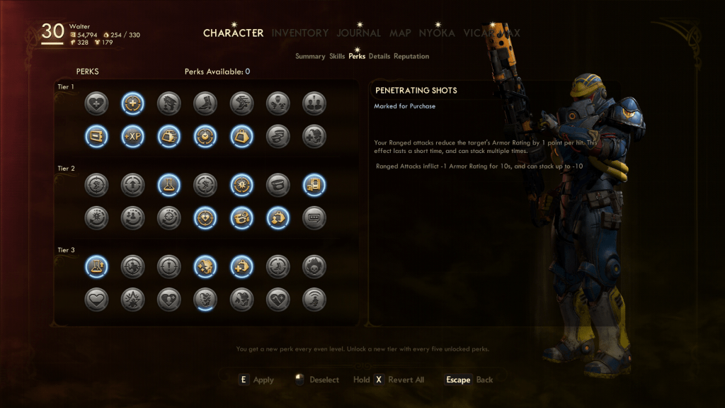 Speaking of picking up armor and weapons, your hero has a carrying capacity that can be buffed several ways – with strength you can decide to endow your hero with, armor mods, and with character perks earned every other level. The weight of consumable items, which Halcyon is covered in, can be halved in the perk system too.